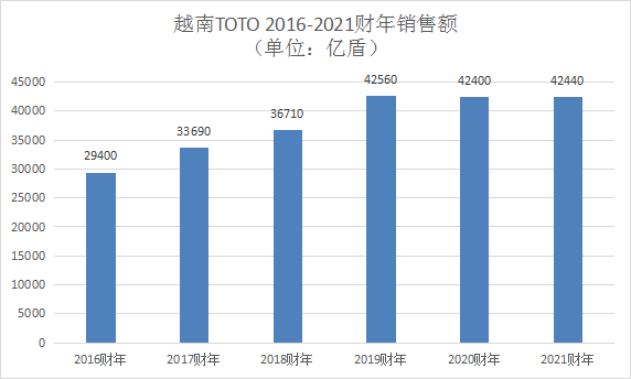 數(shù)據(jù)顯示,TOTO近年在越南的銷售額整體平穩(wěn)。2019財年突破40000億盾(約人民幣12.00億元)后,2020、2021財年均在42000億盾以上,其中2021財年還是越南疫情反彈較嚴重的一年,這一年TOTO在越南的營業(yè)利潤大幅減少65%。不過,正如TOTO建設(shè)第四工廠不僅為了越南市場,近年越南工廠的產(chǎn)品也大量出口海外市場。以2021財年為例,這一年TOTO在越南的銷售額為42440億盾(約人民幣12.73億元),其中外部顧客銷售額達到14390億盾(約人民幣4.32億元),占比超3成。