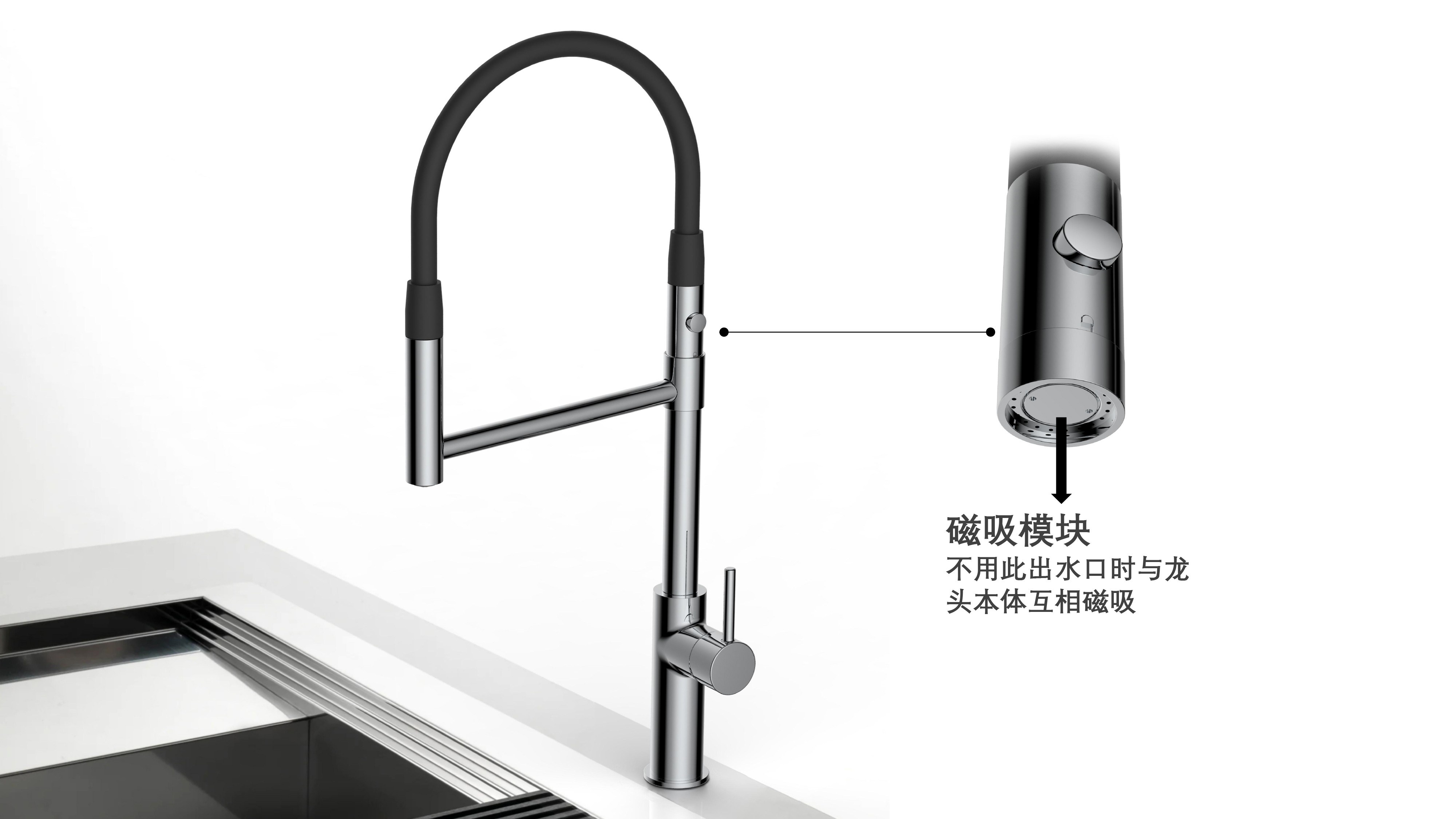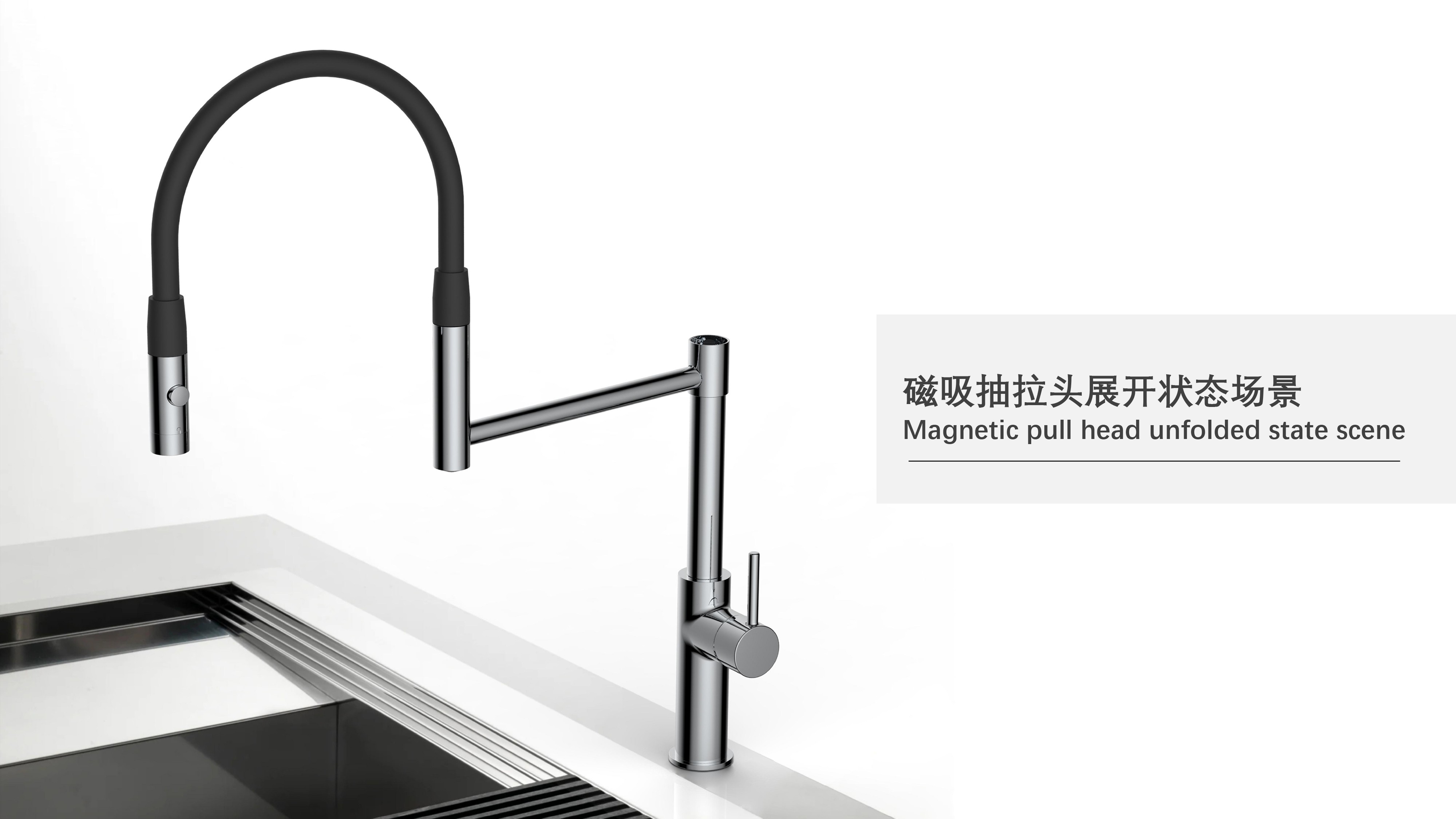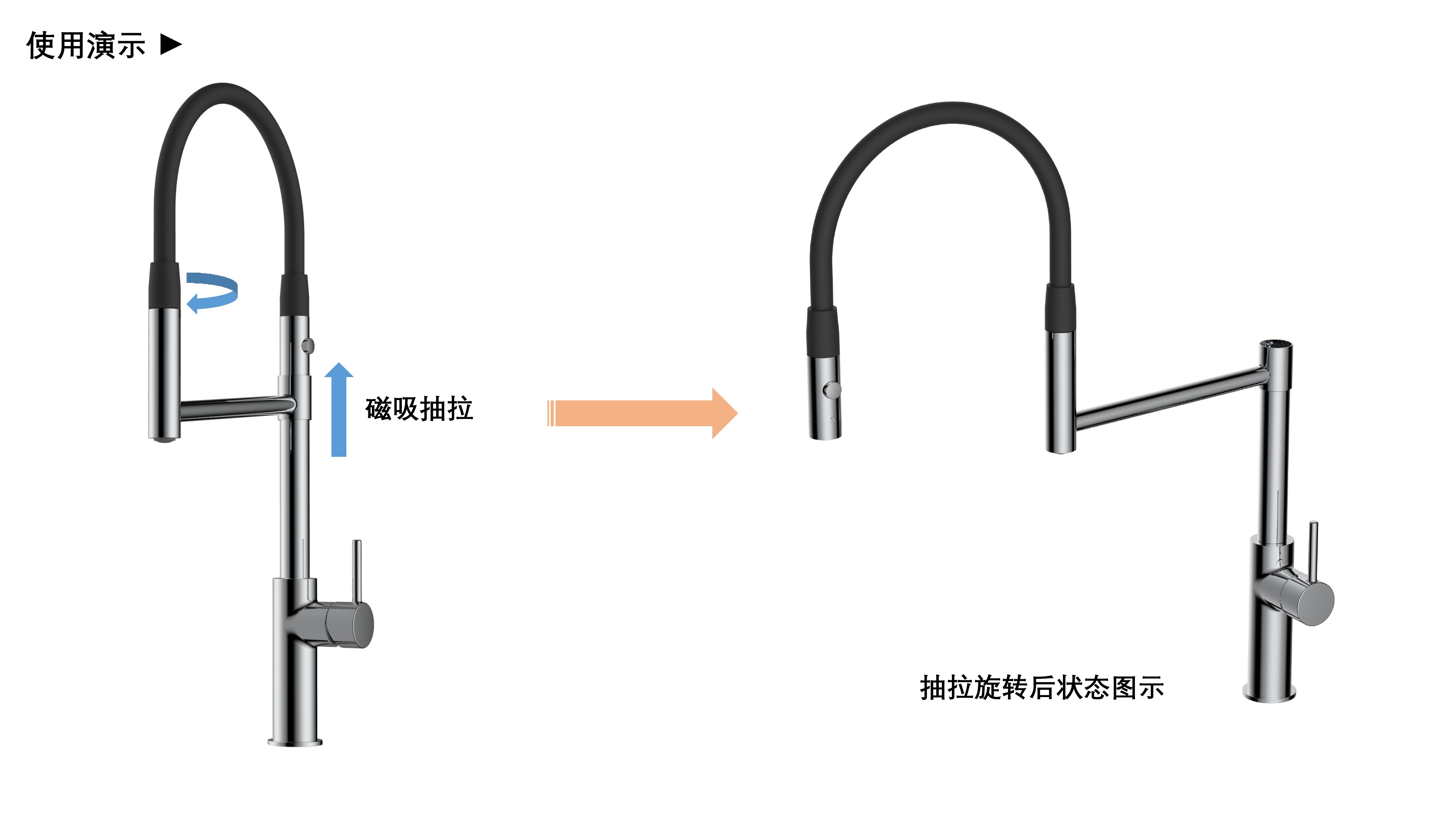 cUPC/ NSF61/ AB100/ NSF372/ Lead Free/ ADA認(rèn)證;磁吸抽拉廚房龍頭;磁吸抽拉頭可旋轉(zhuǎn)展開使用,不用時旋轉(zhuǎn)回原位磁吸固定;兩種出水可根據(jù)需求切換